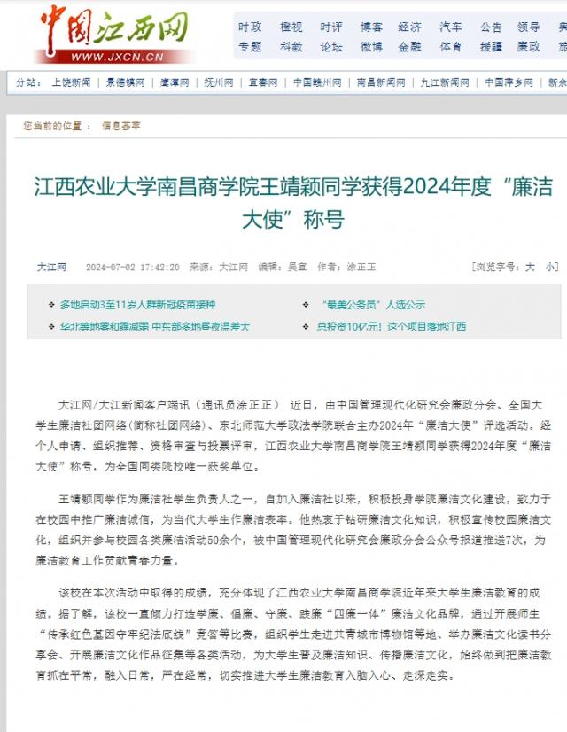 【中国江西网】bevictor王靖颖同学获得2024年度“廉洁大使”称号