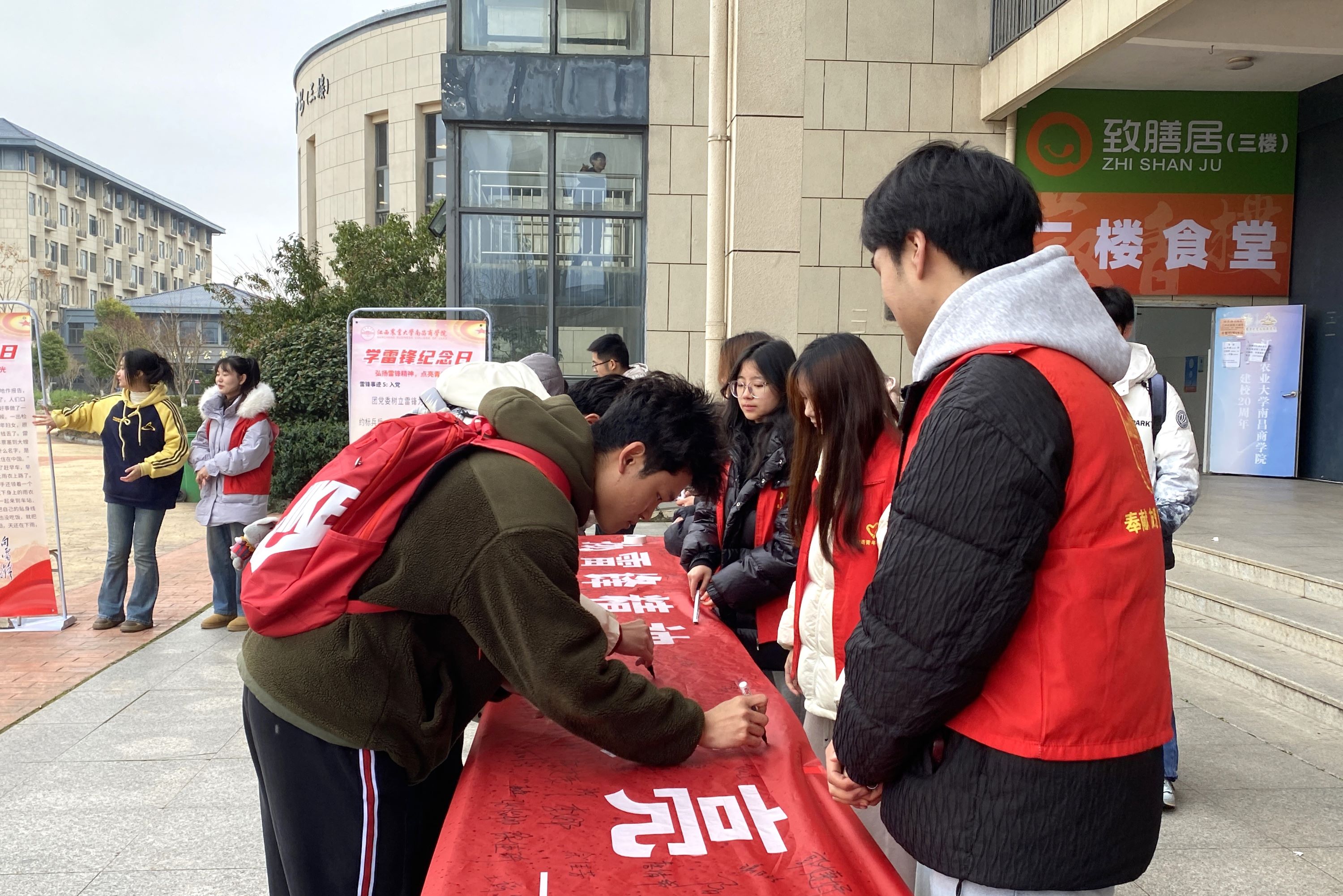 仪式现场,院青年志愿者服务总队组织广大青年志愿者在菽香楼一楼进行“弘扬雷锋精神,点亮青春之光”横幅签名及青年志愿者宣誓仪式,由“五好”宣讲团成员讲述雷锋同志在不同时期的经典事迹。活动尾声,青年志愿者们进行庄严宣誓。