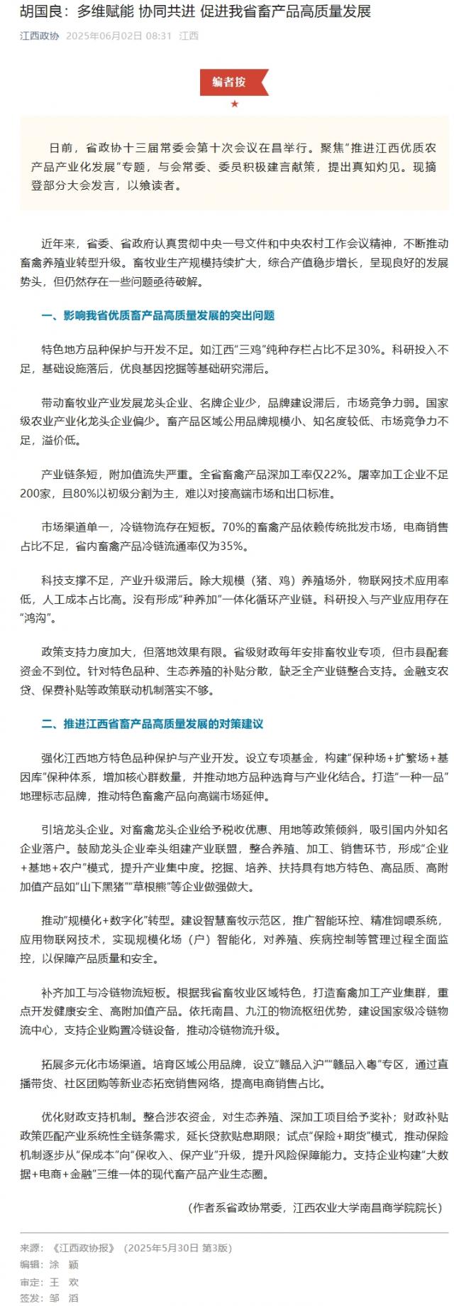 【江西政协】胡国良:多维赋能 协同共进 促进我省畜产品高质量发展