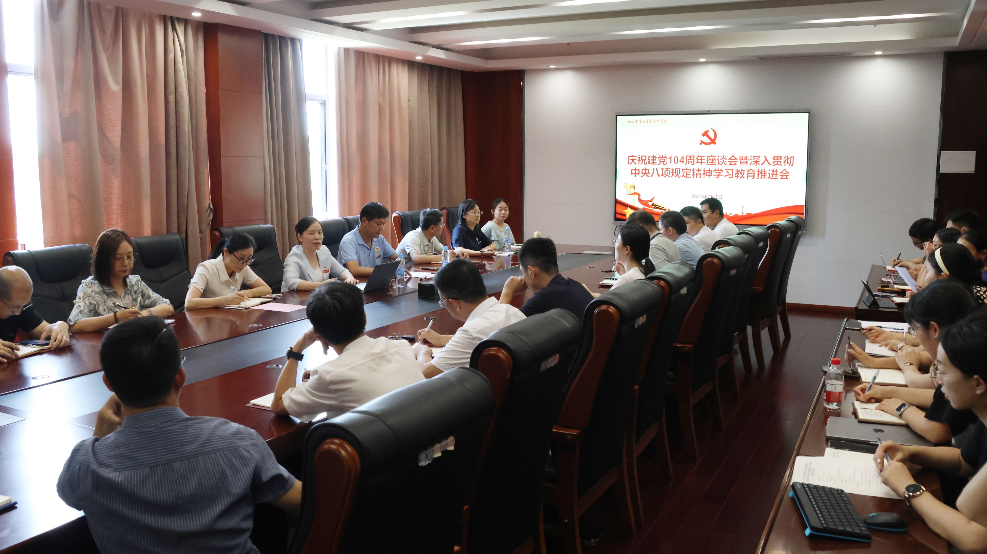 7月1日下午,公司在明道楼331会议室召开庆祝中国共产党成立104周年座谈会暨深入贯彻中央八项规定精神学习教育推进会。公司党委书记黎敏主持,党委副书记李海峰、各党总支(副)书记、直属教工党支部书记及职能部门负责人参会,以“学纪、守纪、执纪”的实际行动向党的生日献礼。