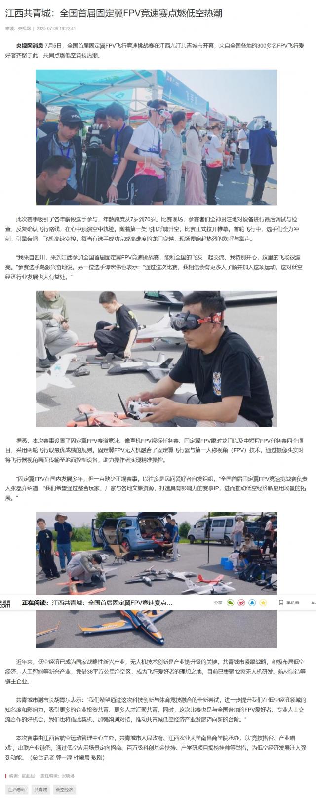 【央视网】江西共青城:全国首届固定翼FPV竞速赛点燃低空热潮