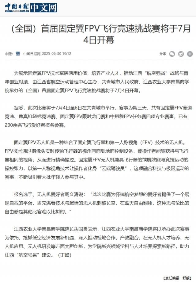 【中国日报】(全国)首届固定翼FPV飞行竞速挑战赛将于7月4日开幕