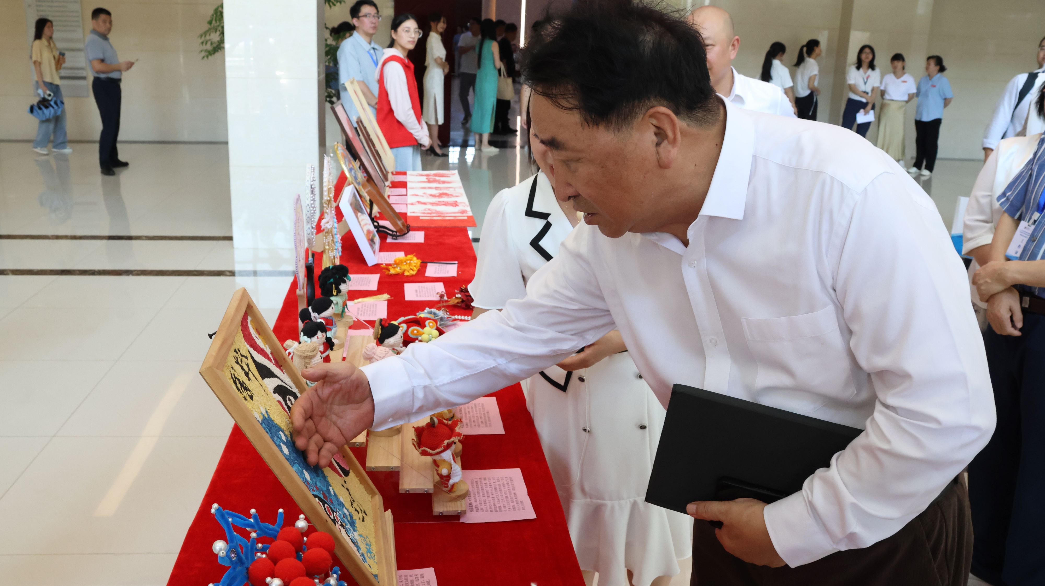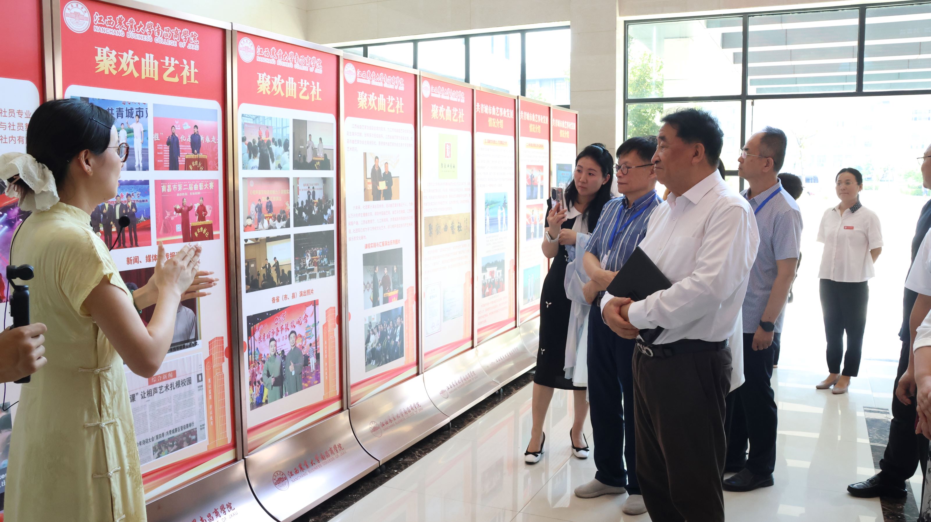 大会开始前,姜昆和伟德体育张高亮副董事长一同参观了中华优秀传统文化作品展,并听取了解“共青城市老员工曲艺联盟”“聚欢曲艺社”和公司社团等组织在校园文化建设方面的累累硕果。