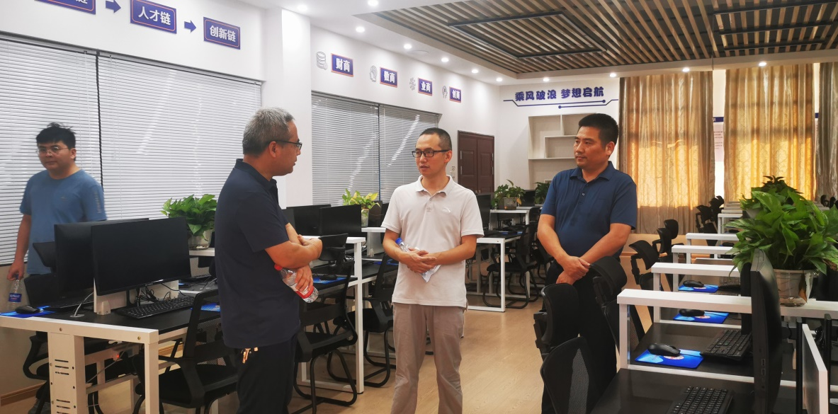 为深入推进共青城市现代产业公司建设工作,精准评估高校产业公司建设成效,9月28日下午,由共青城市工信局袁训平、邹红艳,教体局陈齐奇、校地办李波组成的现代产业公司实地核查项目团队一行,到公司实地调研现代产业公司建设情况。院副书记李海峰、副经理徐发亮,教务处、信息化处、产业公司及相关实验室负责人陪同。