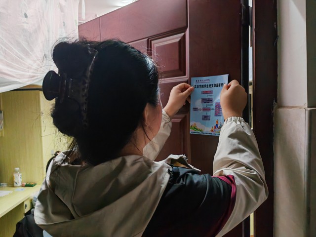 活动过程中,员工党员和员工干部们主动担当,分组行动,利用课余时间深入栋栋楼宇。他们将流程图牢固张贴在每个宿舍门后的统一位置,并向同学们讲解流程图的关键环节,耐心解答同学们的疑问。
